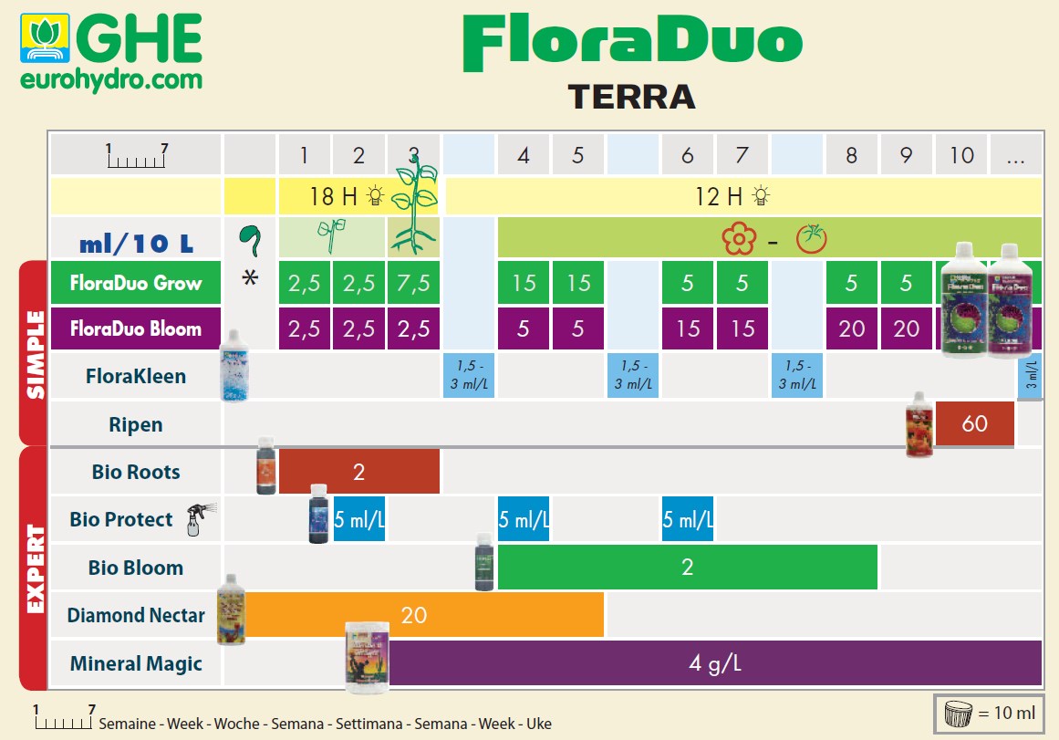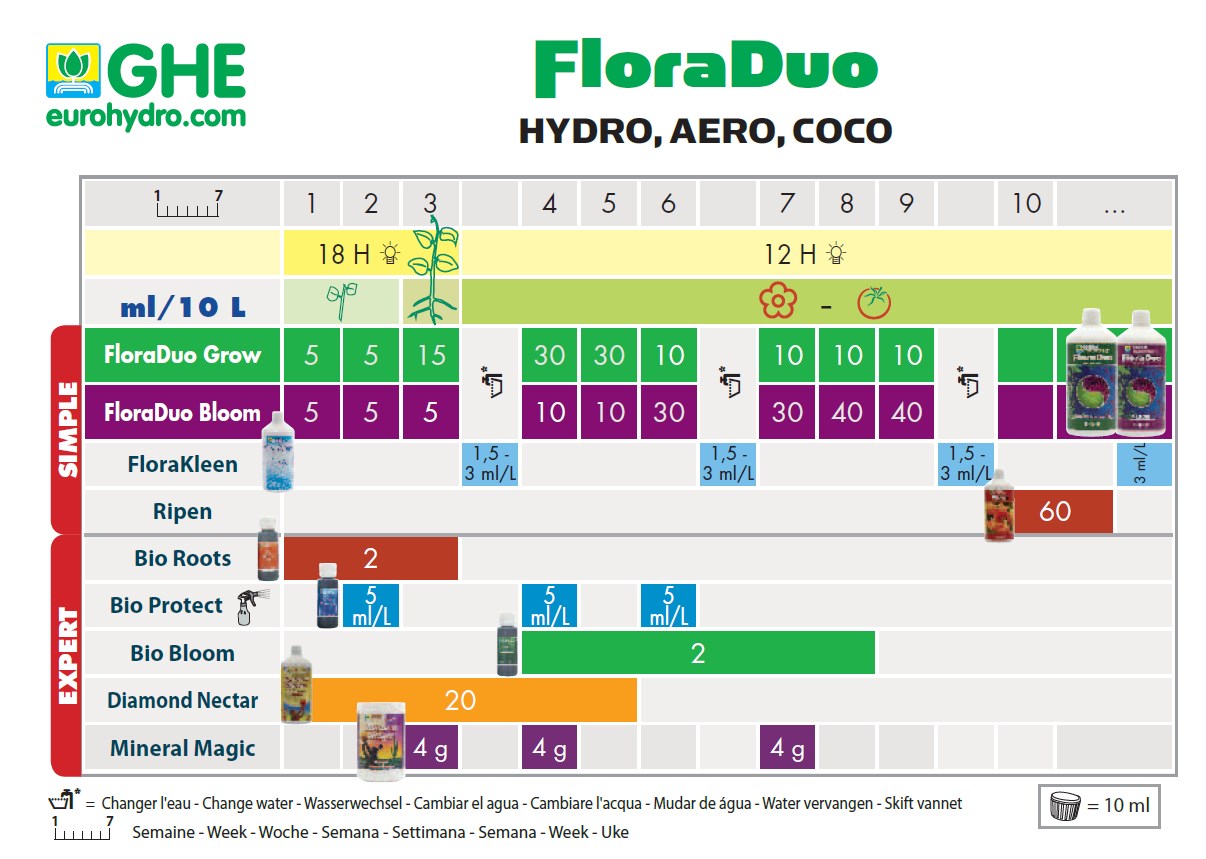 Existen dos tablas de fertilizantes FloraDuo distintas según el tipo de cultivo: la primera es para el cultivo aeropónico, hidropónico y en fibra de coco. La segunda es para cultivos en tierra (macetas) o en exterior. También hay dos sub tablas de riego FloraDuo (simple y experto) para que puedas elegir en función de tu presupuesto. La tabla experto incluye toda una serie de aditivos que darán un empujón extra a tu cultivo: estimuladores de raíz, estimulador de floración, silicio, ácidos úmicos y fúlvicos…